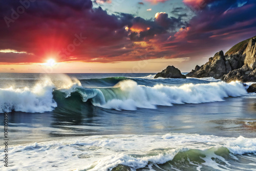 © Watcharakorn, Fototapeta premium iceberg in the sea. sea, sky, sunset, ocean, water, beach, clouds, landscape, sunrise, nature, cloud, sun, wave, horizon, coast, seascape, lake, summer, stone, evening, dusk, rock, travel, orange, sho
