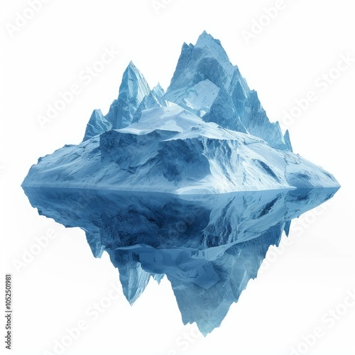 Fototapeta premium Iceberg with snowy mountain peaks floating on calm water creates perfect mirrored reflection against a white background