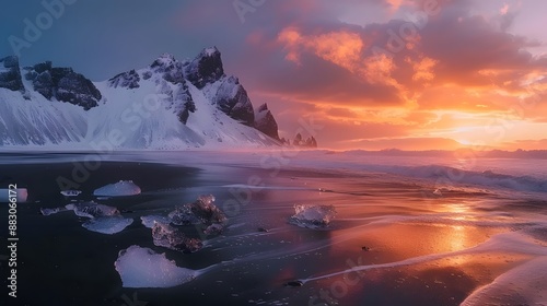 Naklejka premium Icebergs on black sand beach with a colorful sunrise and snow-covered...