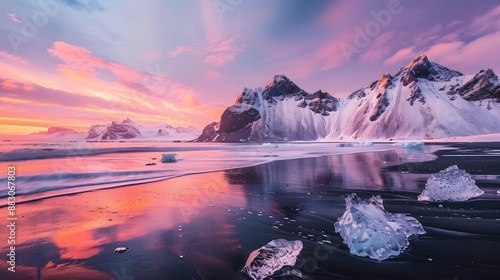 Naklejka premium Icebergs on black sand beach with a colorful sunrise and snow-covered mountains in the background.