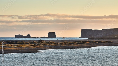 © Gudellaphoto, Fototapeta premium Iceland landscape black sand beach in Dyrholaey in twilight