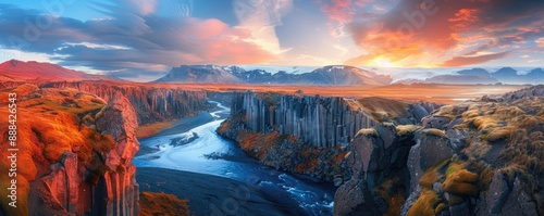 Fototapeta premium Icelandic Landscape at Sunset with Basalt Columns and River