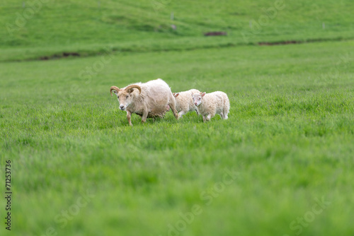 © 1tomm, Obraz premium Icelandic sheep grazing on a green pasture in Iceland.