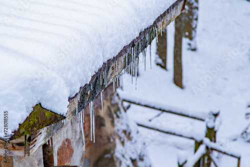 © Dmitry Koshelev, Fototapeta premium Icicles Hanging From A Roof. Roof Icicles. Spring Melting Snow. Snow Melt Roof. Moss Roof Winter. End of Winter.