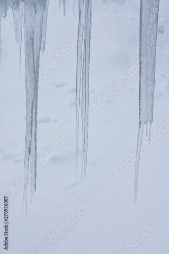 Fototapeta premium Icicles in a gloomy foggy winter day. Snow as background.