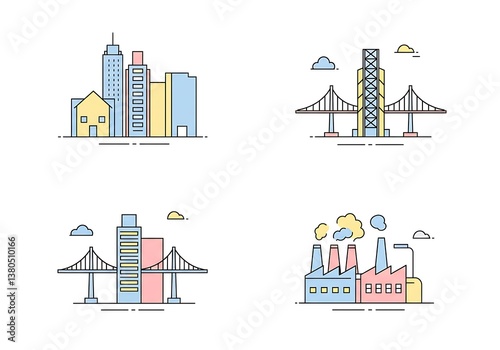 Obraz premium Icon Set Presenting Building, Bridge, and Industrial Plant in Minimal Style