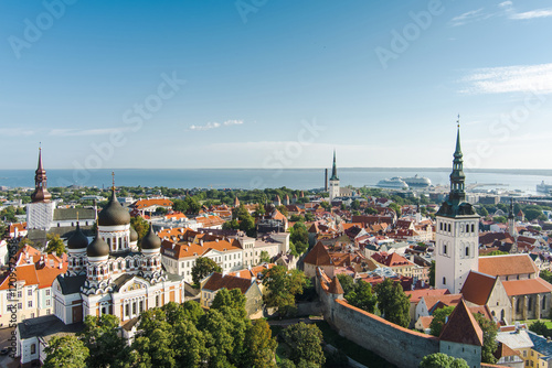 © MNStudio, Fototapeta premium Iconic aerial skyline view of Tallinn Old Town on a sunny summer morning. St. Olaf's, St. Michael's churches, Alexander Nevsky Cathedral, defensive walls, rooftops.