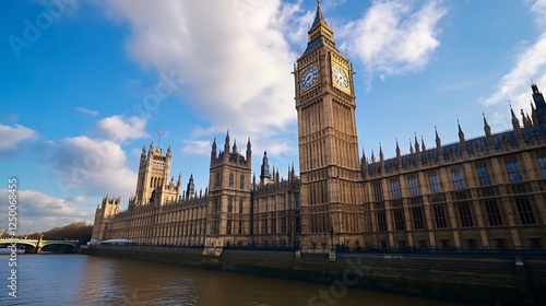 © Generative AI, Fototapeta premium Iconic Big Ben Tower in London with Blue Skies and River Reflection : Generative AI