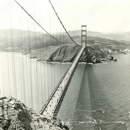 Obraz premium Iconic bridge, coastal view, construction, San Francisco bay, historical photo