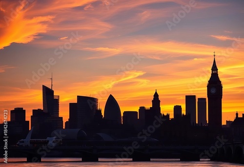 © Lalita, Fototapeta premium Iconic London skyline silhouette at sunset, featuring key landmarks, view, landmarks