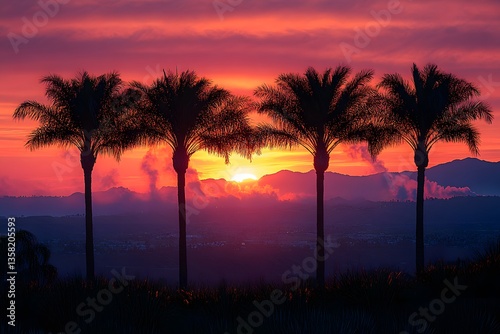 © Five Million Stock, Obraz premium Iconic palm trees silhouetted against an orange sunset with smoke rising from the hills,