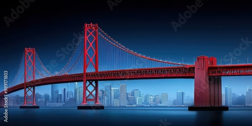 © missisya, Obraz premium Iconic Red Suspension Bridge Over Skyline Cityscape