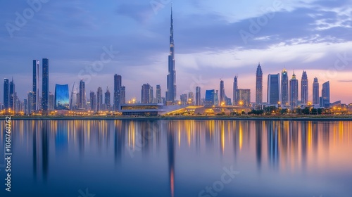 Fototapeta premium Iconic skyline featuring modern architecture at dusk background