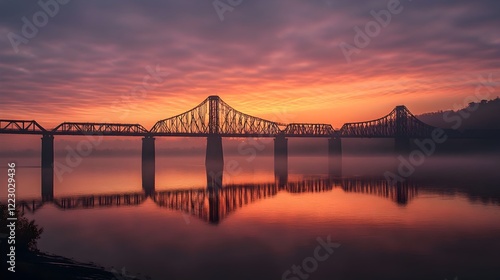 © Wilasinee, Naklejka premium Iconic suspension bridge spanning over a peaceful river reflecting a dramatic sunrise or sunset skyline with vibrant colors and atmospheric lighting