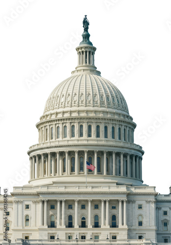 © Greg, Obraz premium Iconic United States Capitol Building dome with Statue of Freedom and American flag, detailed neoclassical architecture against a clear blue sky with no shadows, ultra-realistic UHD architectural