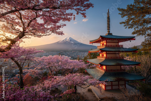 © Creative Valley, Fototapeta premium Iconic view of Mount Fuji and pagoda with cherry blossoms in bloom