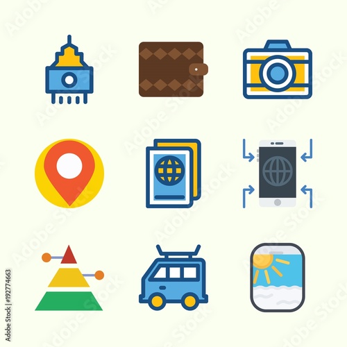 Fototapeta premium Icons about Travel with photo camera, wallet, passport, skyscraper, van and smartphone
