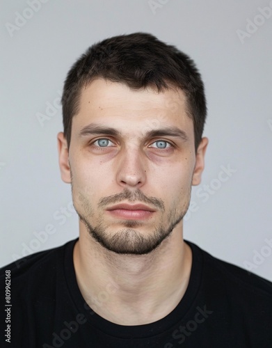 Fototapeta premium ID Photo for Passport : European adult man with straight short black hair and blue eyes, stubble, without glasses and wearing a black t-shirt