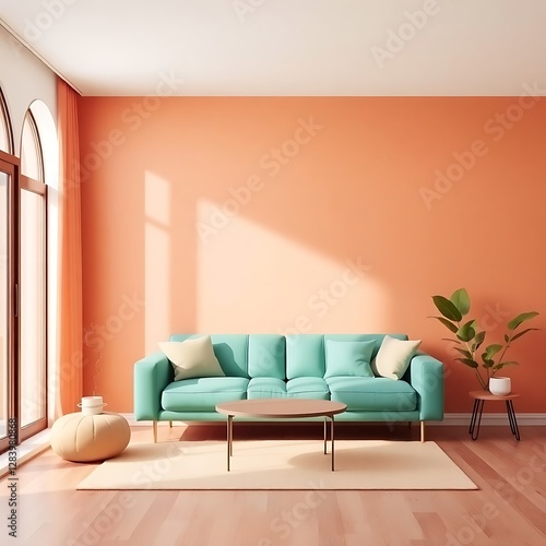 © Graph Art, Fototapeta premium Idea of a blue minimalist living room interior with sofa, vases on the wooden floor and decor on the large wall and white landscape in window. Home nordic interior. 3D illustration