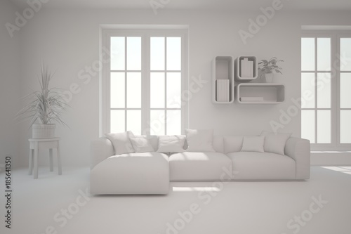 © AntonSh, Fototapeta premium Idea of white minimalist room with sofa. Scandinavian interior design. 3D illustration