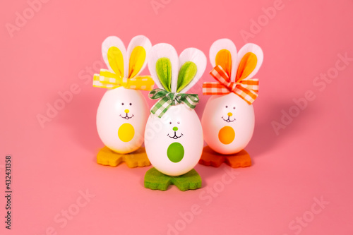 © Aleksander, Obraz premium Ideas for holiday decoration. Easter eggs looking like a rabbit. With a painted face. On a light pink background. Copy space. Isolated