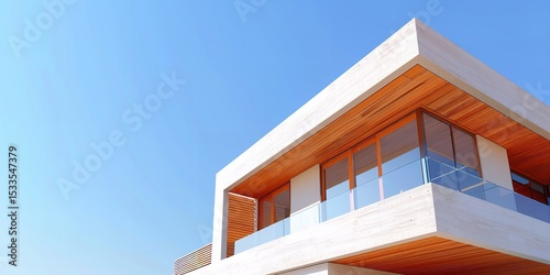 Fototapeta premium ideas for sustainable buildings. A contemporary structure featuring timber details set against a clear blue sky, Generative AI.