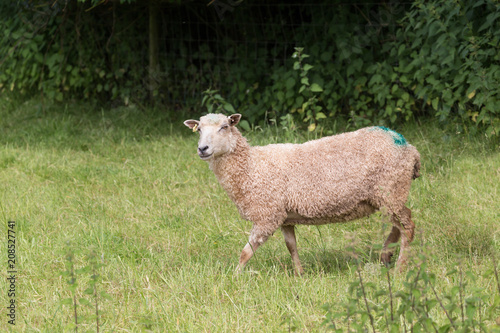 Obraz premium Idillic landscape with sheep, lambs, ram on a perfect juicy gree
