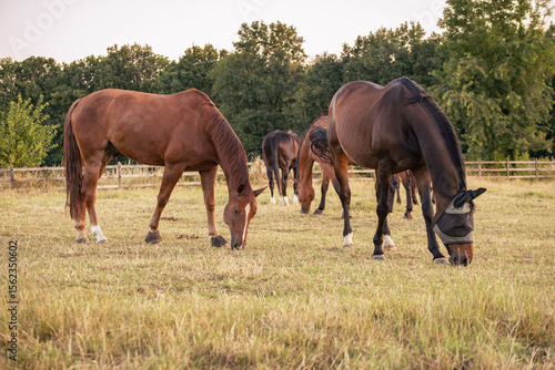 Obraz premium Idylle auf der Koppel am frühen Morgen im Sommer: ruhig grasende Pferdeherde mit und ohne Fliegenmütze