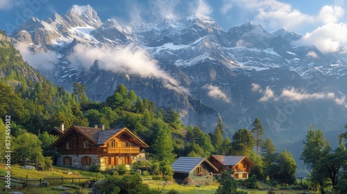 Fototapeta premium Idyllic Alpine Retreat: Snow-Capped Peaks, Charming Cottages, and Serene Scenery