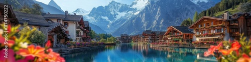Fototapeta premium Idyllic alpine village, tranquil lake reflection, snow-capped mountains, traditional wooden chalets, colorful flowers in foreground, serene atmosphere, blue sky with wispy clouds, picturesque landscap