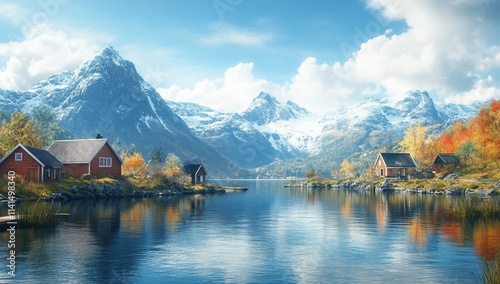 © Nabil, Fototapeta premium Idyllic autumn scene red houses by a calm lake, snow-capped mountains in background.