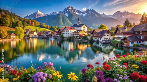 © prapatsorn, Fototapeta premium Idyllic Bavarian Lakeside Village, Alpine Mountain Scenery, Germany