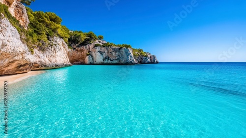 © medalinebow, Fototapeta premium Idyllic Beach Scene with Turquoise Waters and Cliffs under Clear Blue Sky