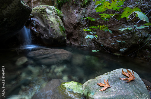 © Michalis Palis, Fototapeta premium Idyllic calm lake with blue clean water and small waterfall flowing between the rocks.