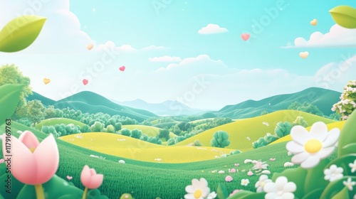 © Umi Sakina, Fototapeta premium Idyllic cartoon landscape with rolling hills, flowers, and hearts.