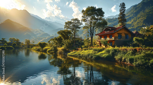 © IRStone, Fototapeta premium Idyllic Chinese village and countryside view with small river, mountains and forest