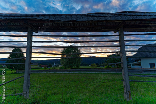 © Michael Derrer Fuchs, Obraz premium Idyllic close-up view of hayrack at farmland at village of Zabnica on a blue cloudy summer evening. Photo taken August 10th, 2023, Zabnica, Kranj, Slovenia.