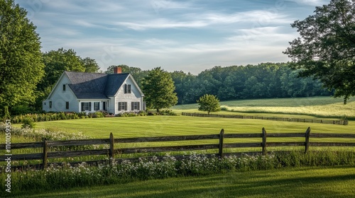 © Media Srock, Obraz premium Idyllic Country Farmhouse with Scenic Landscape