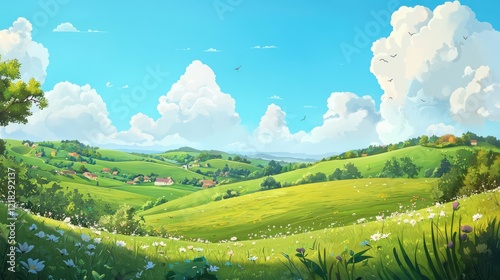 Fototapeta premium Idyllic Countryside Landscape with Rolling Green Hills and Charming Village