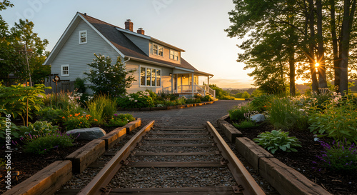 Naklejka premium Idyllic Countryside Residence with Lush Garden and Warm Sunset Glow