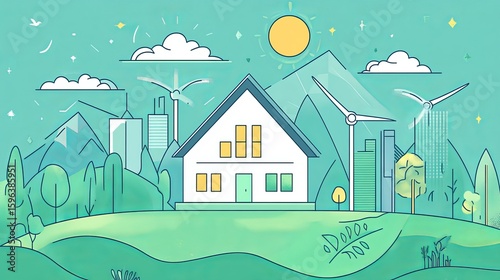 Naklejka premium Idyllic eco-friendly house nestled in a vibrant landscape, featuring wind turbines, city skyline, and mountains under a sunny sky