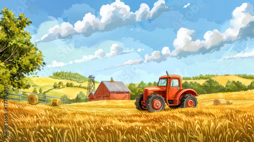 © edojob, Obraz premium Idyllic farm landscape with tractor in fields