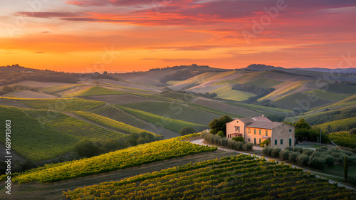 © Indrani, Naklejka premium Idyllic farmhouse on a rolling green hill in the Italian countryside at sunrise, a scenic landscape with vineyards and a colorful sky.