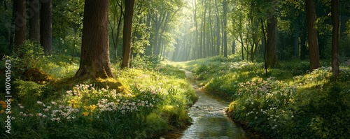 © Cheewynn, Fototapeta premium Idyllic forest clearing in spring, gentle sunlight filtering through trees onto flowering plants near a tranquil stream