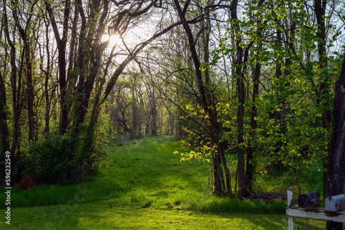 © Mary Salen, Naklejka premium Idyllic golden hour forest path leads away from mailboxes
