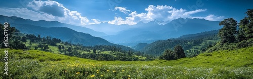 © BG_Illustrations, Obraz premium Idyllic green hill station with flowers and meadows