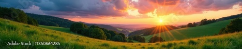 © Yuwadee, Fototapeta premium Idyllic green valley, lush meadows, colorful sunset sky , hills, clouds