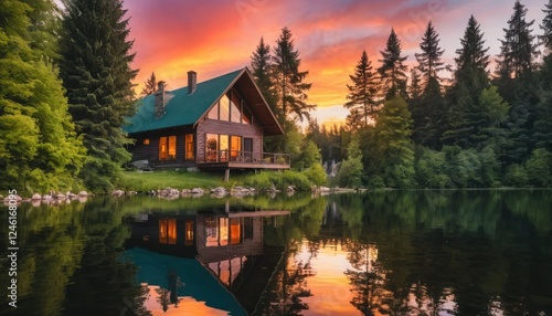 © Rangga, Fototapeta premium Idyllic Lakeside Cabin with Sunset Reflection