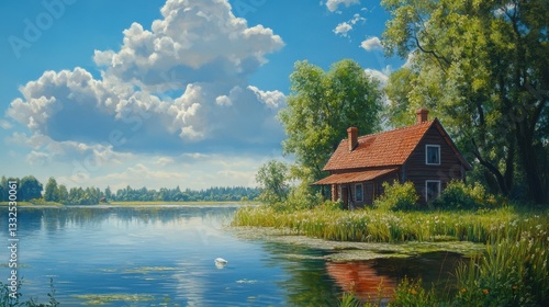 Naklejka premium Idyllic lakeside cottage with lush greenery and white clouds on a sunny day