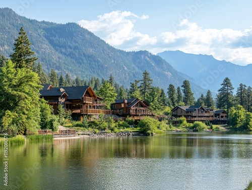 Naklejka premium Idyllic Lakeside Log Cabins nestled in Mountains on a Sunny Day Serene Landscape